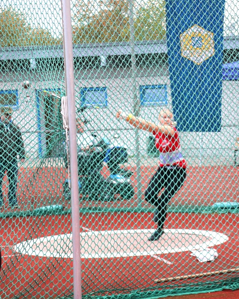 Sabine Rumpf komplettierte im Diskuswurf der W40 ihren Medaillensatz und sicherte sich nach Bronze vor zwei Jahren und Gold vor vier Jahren nun Silber. Bei den 19 gemeldeten Teilnehmerinnen hatte sie auf dem wirklich schlechten Wurfplatz einen schweren Stand, da die Disken doch stark unter dem schlechten Platz litten und sie mit ihrem Kleber nicht ganz die richtige Mischung für die Finger traf. Der erste Versuch landete vielversprechend bei 44,53 m, doch dann folgten vier ungültige Versuche, was für Sabine vollkommen untypisch ist. Sie war aber nach dem Wettkampf froh und zufrieden und machte schon Pläne für das kommende Jahr. Zu Gold fehlten ihr nur anderthalb Meter. Eine Französin siegte mit 46,07 m.