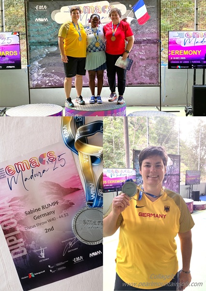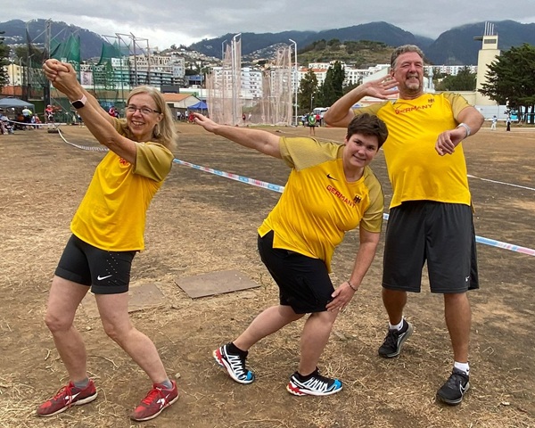 Die drei Masters Athleten der LSG bei der Senioren EM auf Madeira in Pose entsprechend ihrer Wurfdisziplinen (oben v. li.): Jutta Kerth, Sabine Rumpf und Dieter Laux sowie Sabine Rumpf bei ihrer Siegerehrung.