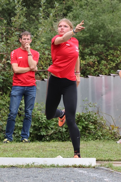 Milla Nierfeld beim Kugelstoßen und im Hintergrund Trainer Sven Medenbach