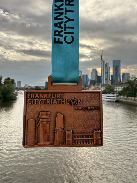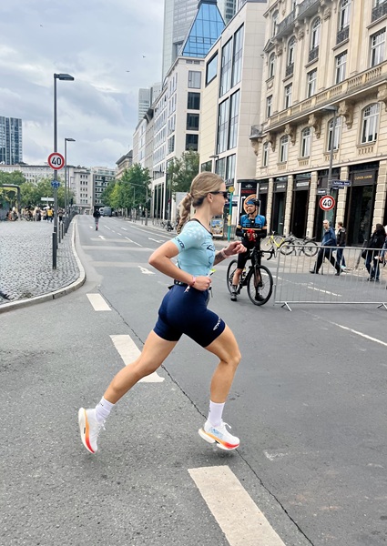 Zum Abschluss kam dann ihre große Stärke und sie bewältigte die 10 km Laufstrecke in insgesamt 44:11 min. Wenn man bedenkt, dass ihr Bestleistung bei 42 Minuten steht, ist das nach dieser Vorbelastung bemerkenswert. Das besondere war dabei, dass die Laufstrecke mitten durch die City ging. Sie hätte selbst nie gedacht, dass sie mal über die Zeil joggen würde.
