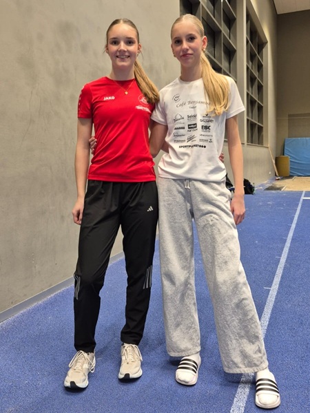 LSG-Sprungtalent Lu Nierfeld (li.) - hier mit ihrer Kaderkollegin Amelie Schulte vom TV Groß-Gerau - siegte beim Hallen-Feriensportfest in Wiesbaden mit ausgezeichneten 5,17 m im Weitsprung.