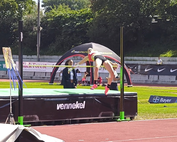 Die 18-Jährige ließ sich jedoch nicht unterkriegen. Zusammen mit ihrem Trainer Sven Medenbach entschied sie, trotz vieler Schürfwunden weiter zu machen und dann von Disziplin zu Disziplin zu schauen, was noch möglich war. Und das sollte sich lohnen! Im Hochsprung fing sie tiefer als sonst an, steigerte sich von Sprung zu Sprung und gewann mehr Vertrauen. Am Ende floppte sie über die neue persönliche Bestleistung von ausgezeichneten 1,59 m und riss selbst die nächste Höhe von 1,62 m nur ganz knapp.
